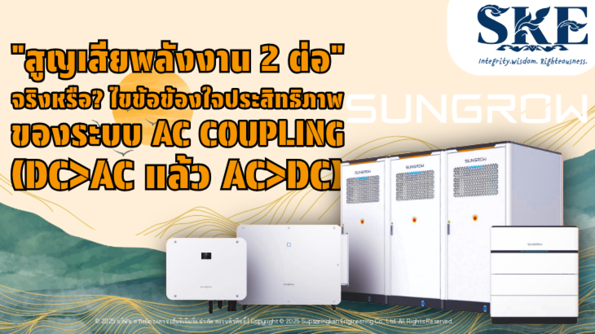 SKE Solar ในฐานะ **ตัวแทนจำหน่ายและติดตั้ง Sungrow อย่างเป็นทางการทั่วประเทศไทย** ขออาสา "ไขข้อข้องใจ" นี้ให้กระจ่าง ด้วยข้อมูลเชิงลึกและเทคโนโลยีของ Sungrow ที่จะพิสูจน์ว่า... แม้ AC Coupling จะมีขั้นตอนการแปลงไฟเพิ่มขึ้นจริง... แต่ "การสูญเสีย" นั้น "น้อยกว่าที่คุณคิด" และ "ประโยชน์" ที่ได้... "คุ้มค่า" อย่างแน่นอน