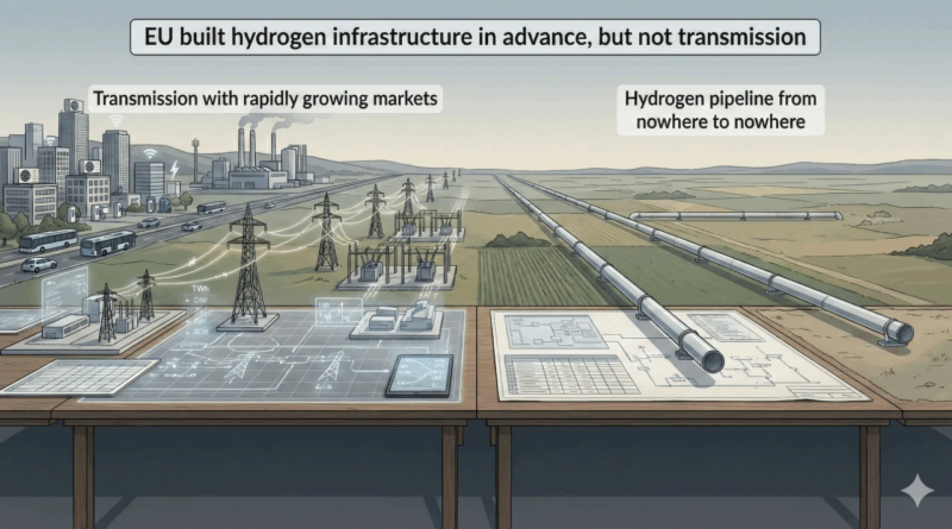 "Europe built hydrogen infrastructure instead of the power grid it needed... prioritizing gas/hydrogen pipelines over the massive grid expansion required for electrification."